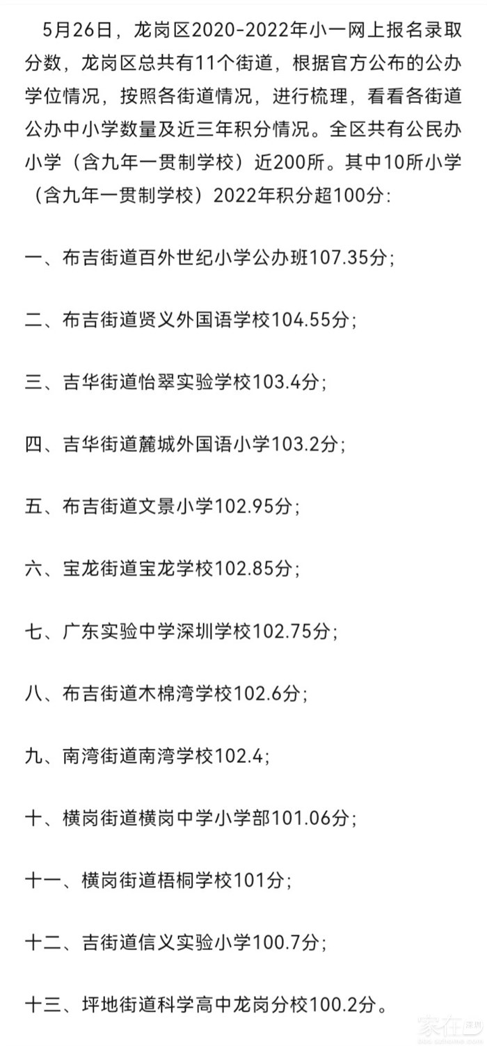 此外,布吉多所学校录取分超100分;昨天,龙岗区11个街道2020-2022年小一报名录取分数出炉!