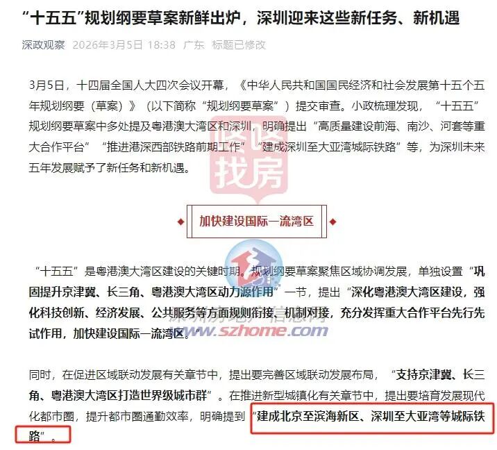 “十五五”规划纲要草案中多处提及粤港澳大湾区和深圳,明确提出“高质量建设前海、南沙、河套等重大合作平台”“推进港深西部铁路前期工作”,并明确提到“建成深圳至大亚湾等城际铁路”。