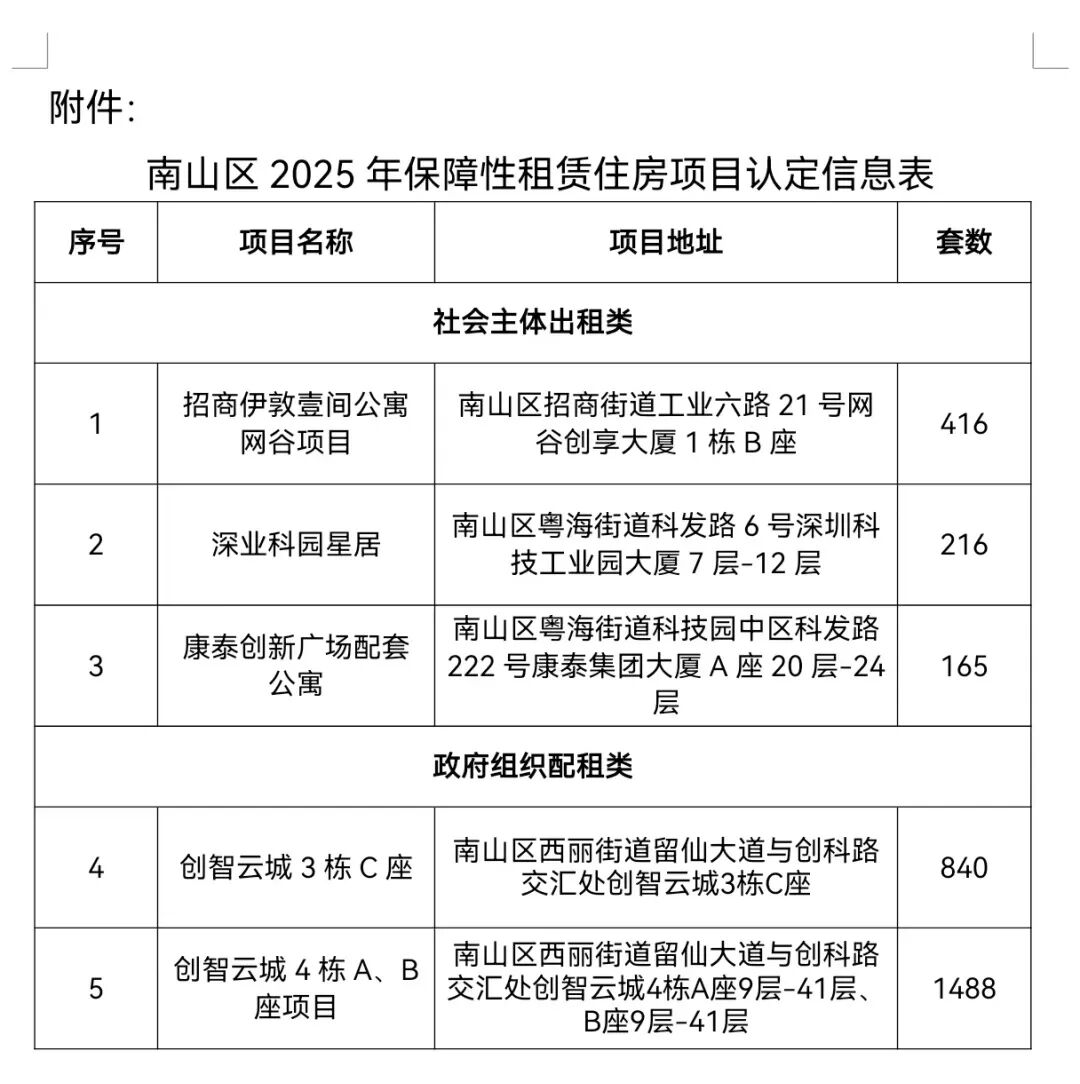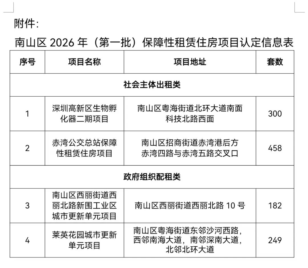 2026年2月14日,南山区住建局发布《南山区2025年、2026年(第一批)保障性租赁住房项目认定信息的公示》,同步公开两个年度首批认定项目。
