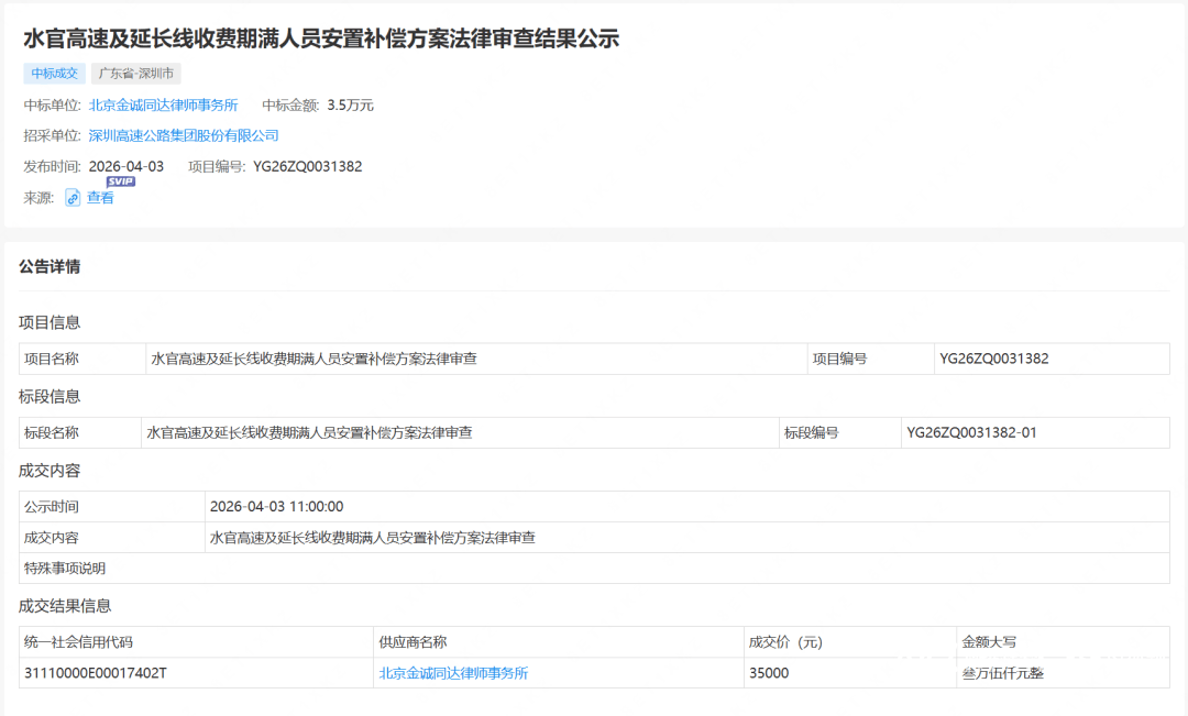 更实质的信号来自今年4月3日。深圳市属国企“深高速”发布公示,正式启动“水官高速收费期满人员安置补偿方案”的法律审查。这意味着,政府与运营方关于“人、财、物”的交接谈判已进入攻坚阶段。